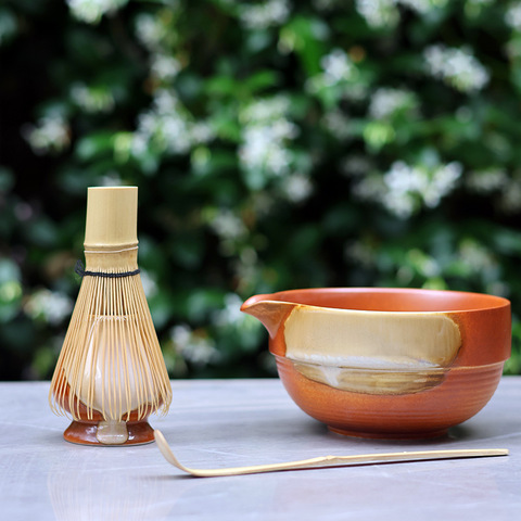 Ensemble de matcha écologique fabriqué au four Fouet à thé et bec en céramique fait à la main avec design brossé vintage